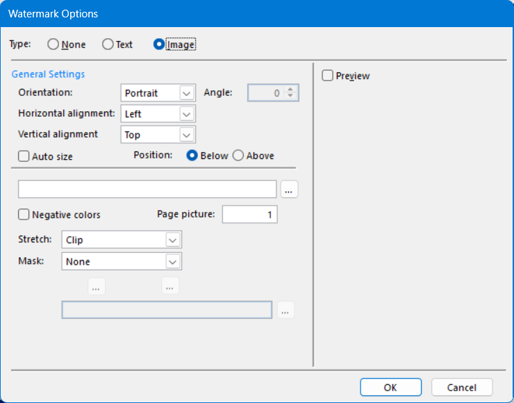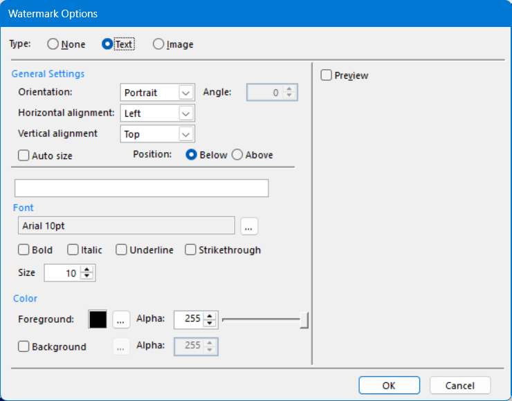 Choose Text to use a text watermark or Image to use an image watermark. Both types of watermarks have the following options:
