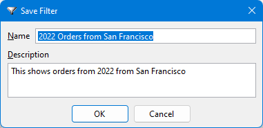 The Store button is enabled when you have at least one condition defined for your filter. When you click this button, or right-click and choose Store Filter from the shortcut menu, a dialog appears which allows you to enter a name for your filter. You might want to include your own name in the filter name so others can tell whose filter it is. A name like "Ron's Filter - Jan/94" might be appropriate. You can also enter a more complete description of the filter if you wish. Type in the name and description and click the OK button. The name of the filter appears below the Store button.