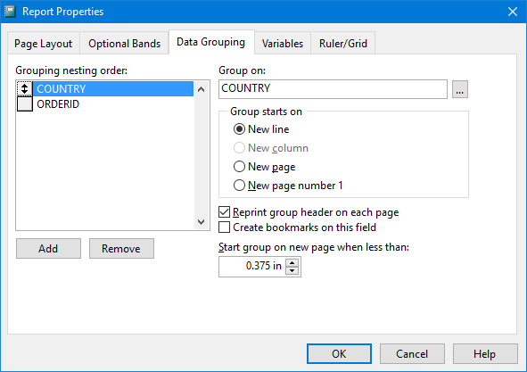 The Data Grouping page specifies how data is grouped in the report. Grouping on City, for example, means that customers for a particular city are printed, and when the city changes, a group break occurs. When a group break occurs, the group footer band for the group is printed, then the group header band for the next city is printed, and then the customers for the next city are printed.