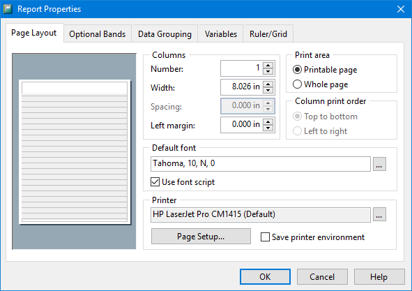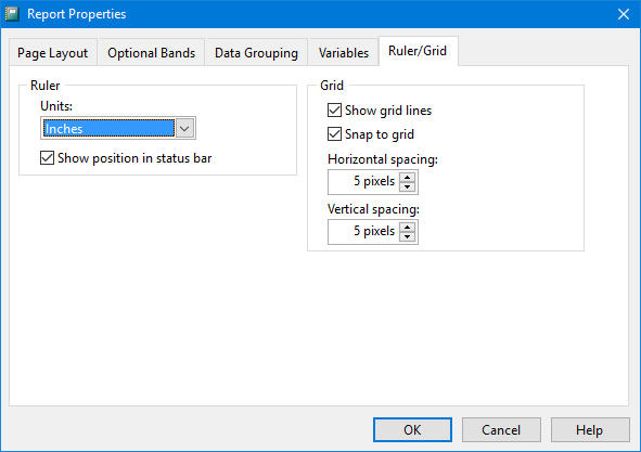 The Report Properties dialog allows you to control many things about the report, including the page layout, optional bands, data grouping, variables, and how the ruler and grid appear.