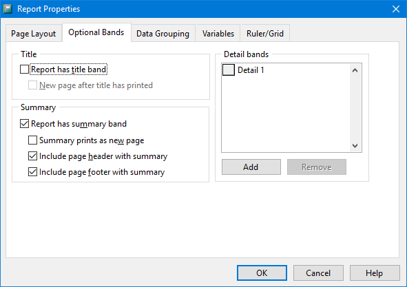 Detail bands: a report normally has only one detail band, but under some conditions, having more than one detail band can be useful. This option shows the detail bands used in the report.