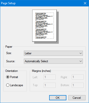 Page Setup: displays the Page Setup dialog, where you select printer and paper settings.