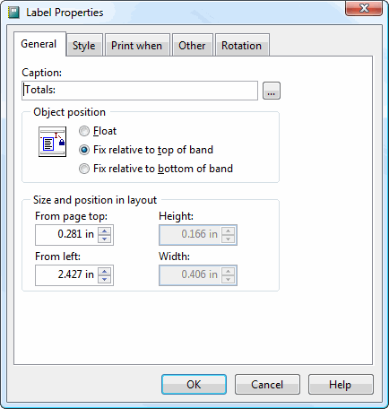 Object position: it's possible the height of a band can change when it's printed. For example, the detail band may only appear as one line high in the Advanced Report Designer, but if a field's Stretch with overflow setting is turned on (see Field Object Properties), that field may take more than one line if it contains a lot of information, and therefore so does the detail band. The object position settings allow you to specify what happens to objects when the band they're in changes height. The choices are: