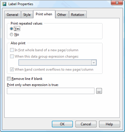 Print only when expression is true: an expression to be evaluated before the object prints. If the expression is true, the object is printed; otherwise, it isn't printed. All other options in this dialog except Remove line if blank are disabled if you include an expression. Click the Expression Builder button to display the Expression Builder.