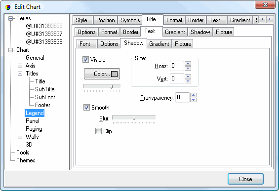 The Shadow subpage of the Title subpage controls the shadow for the shape in which the title appears. It has the same settings as the Shadow Editor dialog.