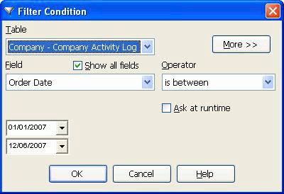 Since we want to filter on date, select "Company Activity Log" from the Table list and "Order Date" from the Field list. Since we want a date range, select "is between" from the Operator list. Enter the desired date range in the values boxes or click the down arrow beside the boxes to select the dates from a calendar. Click the OK button to close the Filter Condition dialog and your condition appears in the Filter dialog. Although you can add other conditions, let's just click the OK button in the Filter dialog for now.
