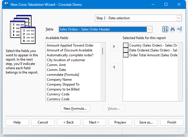 CountryClick this button to display fields in table order. Click it again to display them alphabetically. The setting of this button is remembered, so if you edit a report later, it has the same setting.