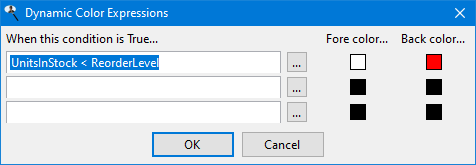 In this dialog, enter the expression you wish to look for (you can click the Expression Builder button to launch the Expression Builder, which makes it easier to enter the expression) and the foreground (text) and background colors to use when that expression is true. For example, in the image above, when UnitsInStock is less than ReorderLevel (in other words, we need to reorder this product), the field appears in white text on a red background. You can use "{VALUE}" as a placeholder for the value of the current field being output rather than specifying the field name. You can enter up to three expressions to change the color. If none of the expressions is true, the color specified for the field is used.