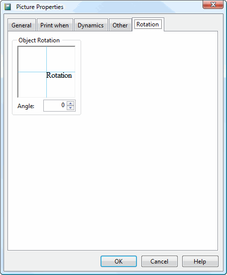 The Rotation page allows you to rotate an object on the report by specifying the rotation angle as a clockwise value (for example, an angle of 90 rotates the object 90 degrees clockwise). A representation of the rotation is shown so you can tell whether you have the desired angle. Note the object doesn't appear rotated in the Advanced Report Designer, but only when the report is run. Also note that using rotation significantly increases report generation time, so use it only when required.