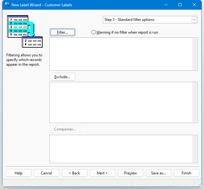 To specify a filter, click the Filter button, and enter the filter conditions using the same procedures described in the Creating a Filter section. You can also specify exclude conditions by clicking the Exclude button and using the procedures described in the Selecting Which Records to Exclude topic.