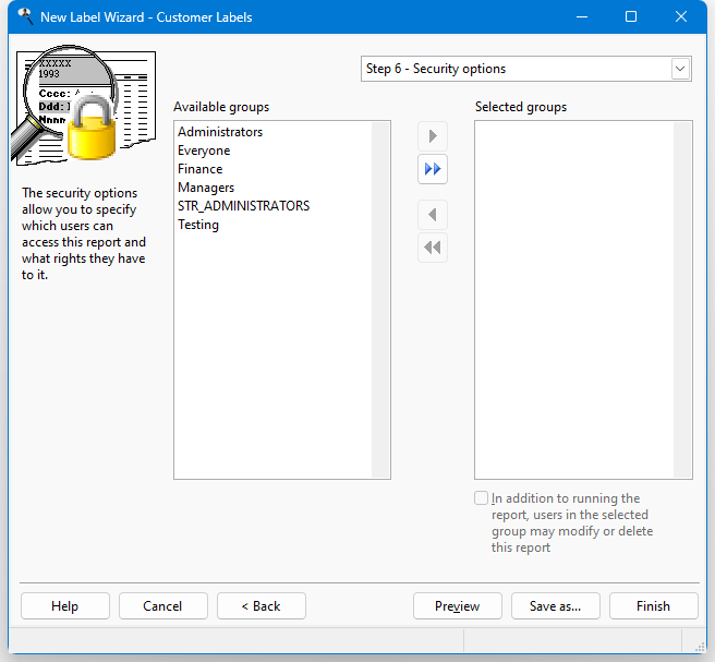 • Selected groups: this shows which user groups have access to this report. By default, the Everyone group has access to a new report, so all users can see it. If you want only certain users to see it, remove the Everyone group from the Selected list and add the appropriate groups from the Available list. If no groups have access to the report, the report is essentially private, available only to you.