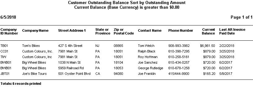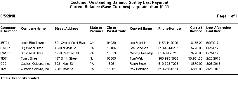 Customer Outstanding Balance Sort by Last Payment: This report shows outstanding balances for customers sorted by last payment.