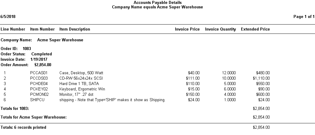 Accounts Payable Details: This report prints a list of Accounts Payable Details by Company and shows how to print each group on a new page.