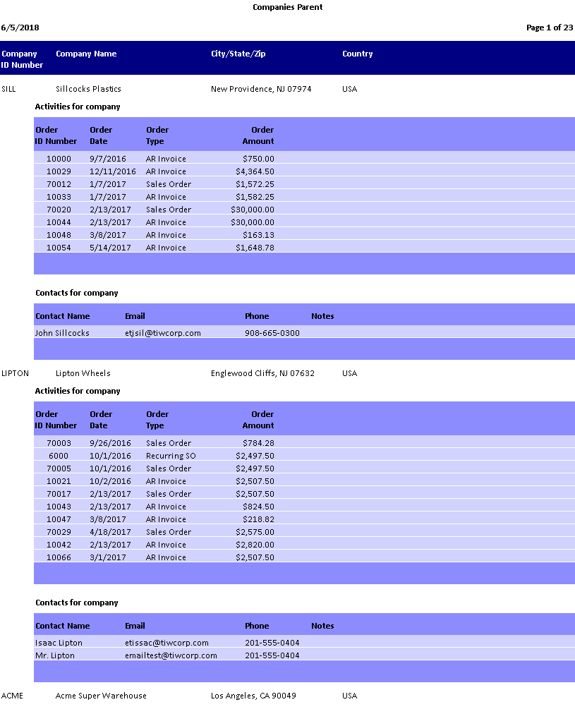 Companies Parent: This report uses subreports to show which contacts and activities belong to each company. It also shows the new Stylish Blue template.