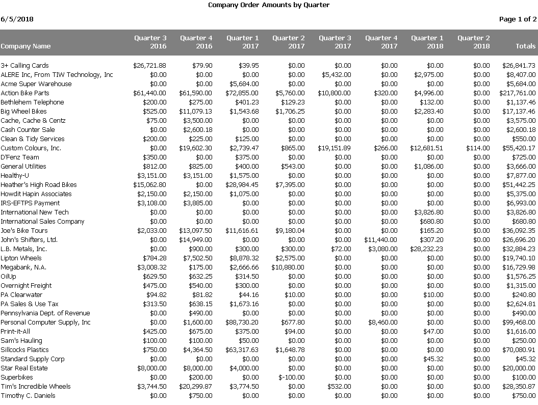 Company Order Amounts by Quarter: This report shows the sum of Order Amounts by Company broken up by Quarter.