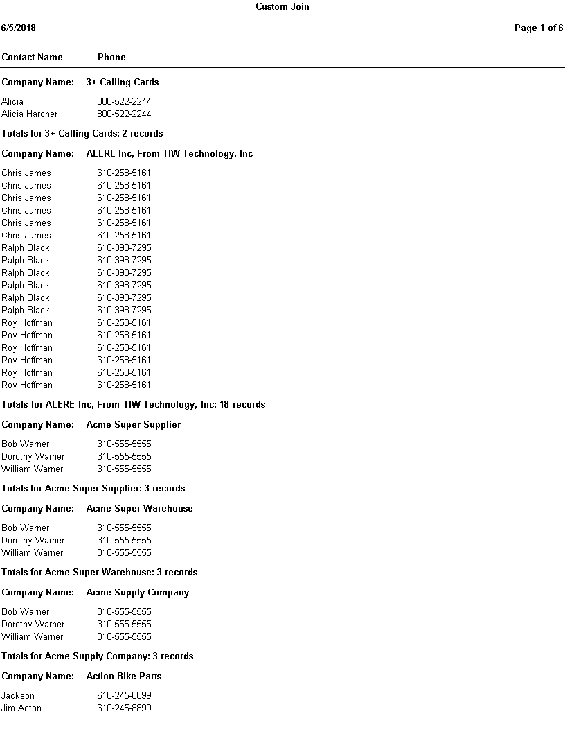 Custom Join: This report uses a custom join to only show those Companies that have Contacts listed. The default behaviour is to show all Companies even if they have no Contacts.