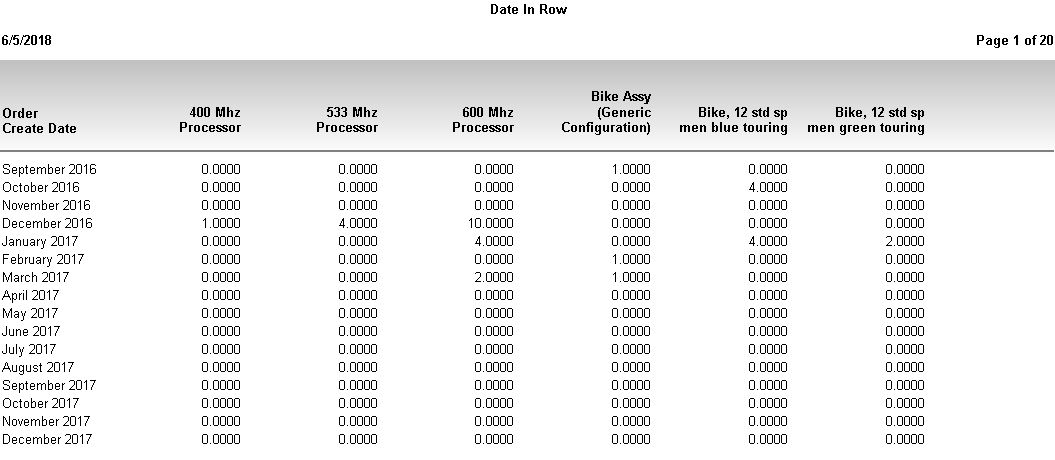 Date In Row: This cross-tab report shows how dates can be formatted in row fields as year, quarter, month, and so on. It also shows how templates can format the totals differently than the rest of the data.