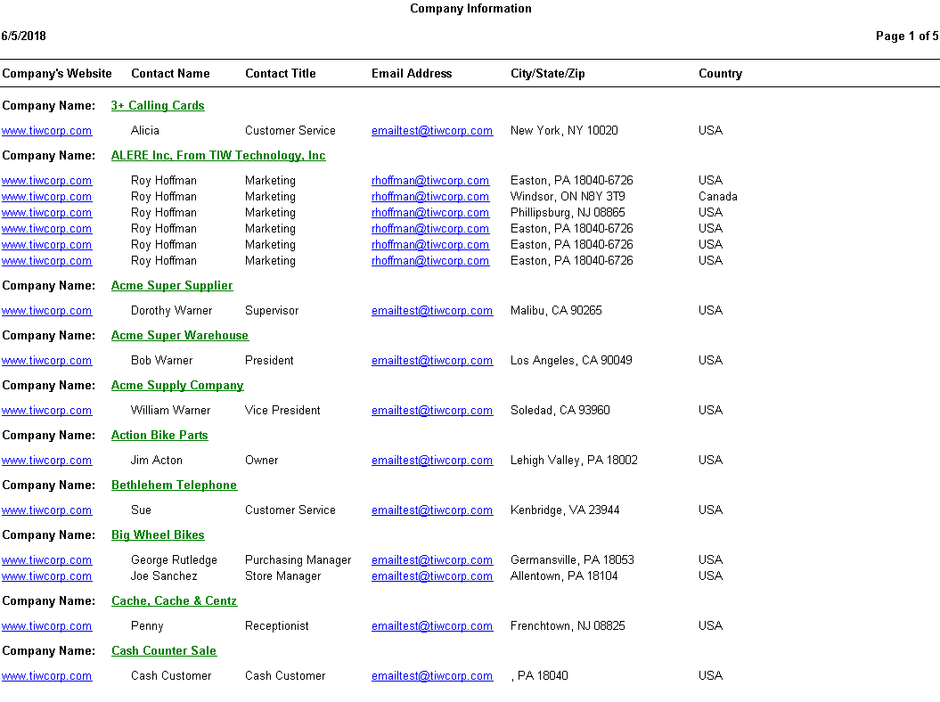 Drilldown Parent - Company List: This report demonstrates the drilldown features. Clicking the "Company's Website" field will automatically open your web browser. Clicking the "Email address" field will automatically open your Email program. Clicking the "Company Name" will automatically run the "Drilldown Child - Company Activity" report.