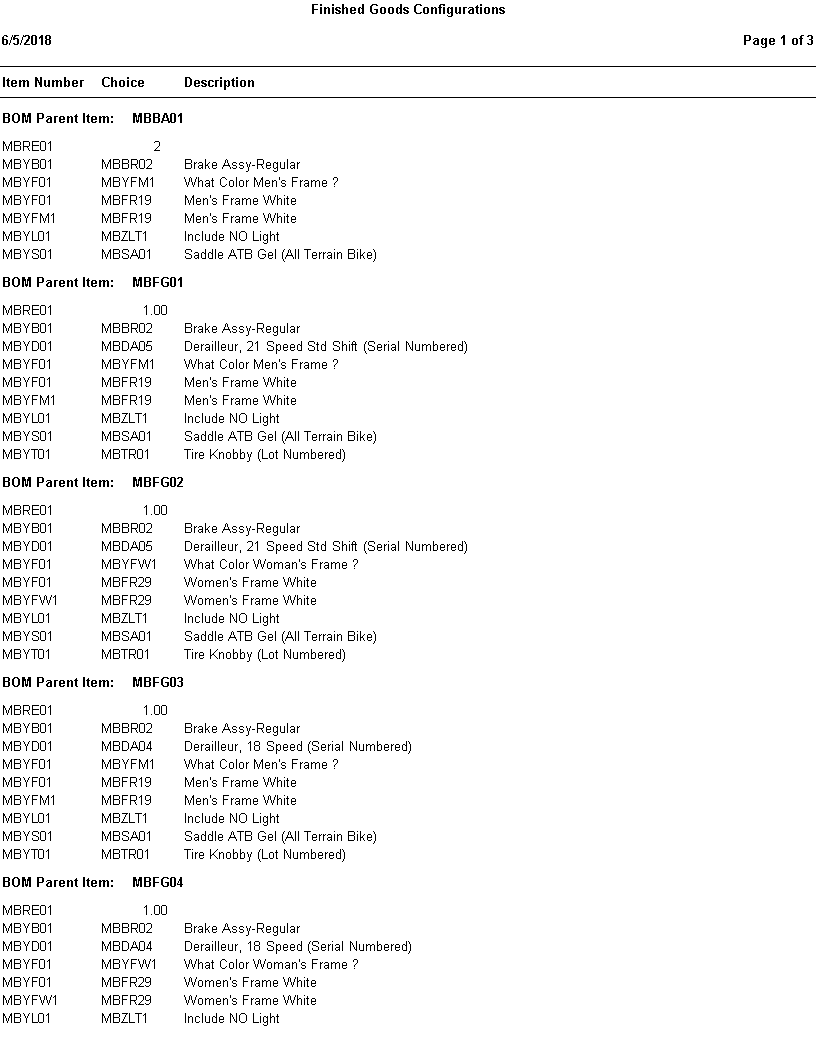 Finished Goods Configurations: This report lists all the Finished Goods Configurations.