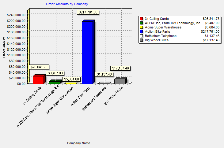 Order Amounts by Company: This report show a chart summing all "Order Amount's" by "Company Name".