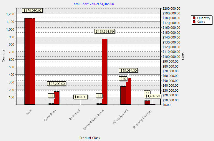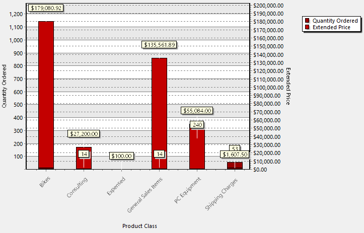 Right-Axis Title: This report shows how you can set the right-axis title for a chart and have the legend display the titles rather than field headings. It also shows how to display the total value for the chart in a title.
