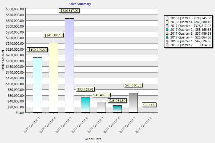 Detailed Sales Report: This report is drilled down to from the Sales Summary Chart report. It shows how you can drill down from an aggregate date, such as Quarter, to a date range.
