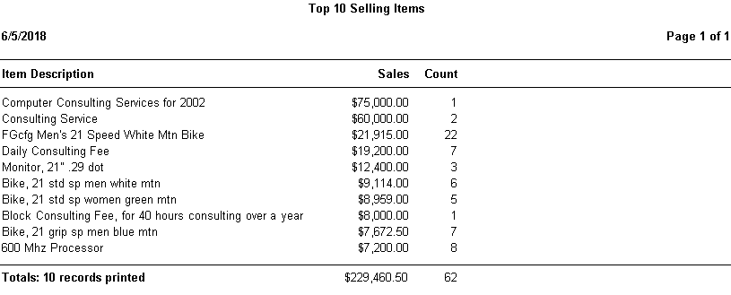Top 10 Selling Items: This report prints the top 10 selling items from the Sales Order Line Items.