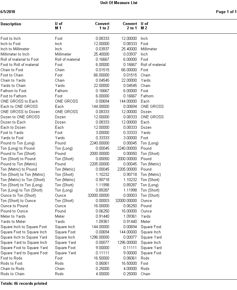 Unit Of Measure List: This report lists all Units of Measure (UOM) and the conversion factor between them.