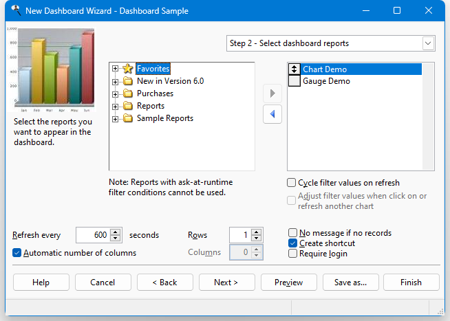 Automatic number of columns: if this option is turned on (the default), the dashboard window determines how many columns to display based on the number of reports and the number of rows. For example, if there are six reports and two rows, the dashboard has three columns. Turn this setting off to manually set the number of columns, especially if you want to cycle through sets of reports (see the note below).