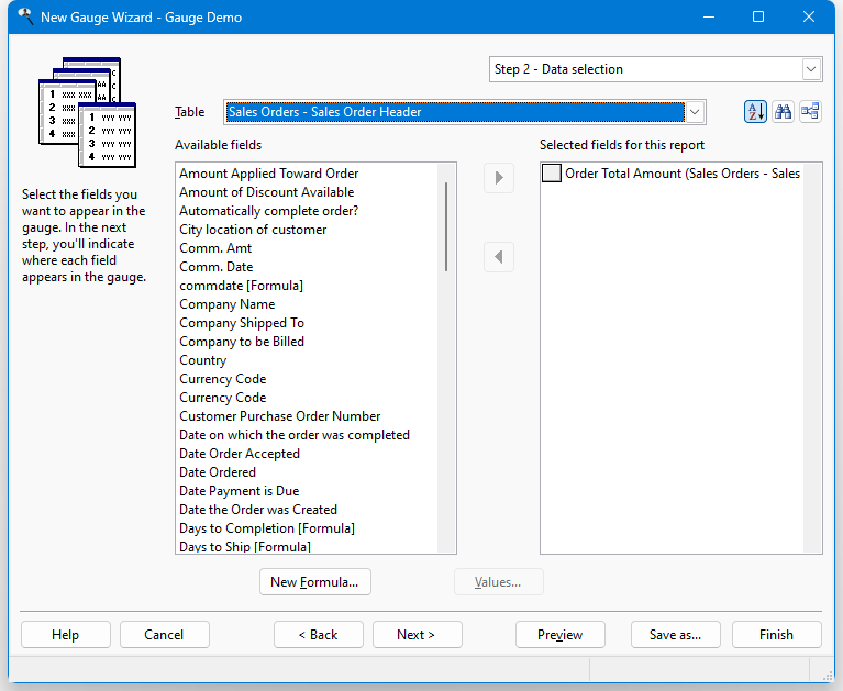 : a long list of fields can make it difficult to find the ones you're interested in. If you know part of the field caption you're looking for (such as a field with "tax" somewhere in the caption), click this button, enter the text, and click OK. If there are any fields that match, the first one is selected. Press F3 to find the next one containing the same text.