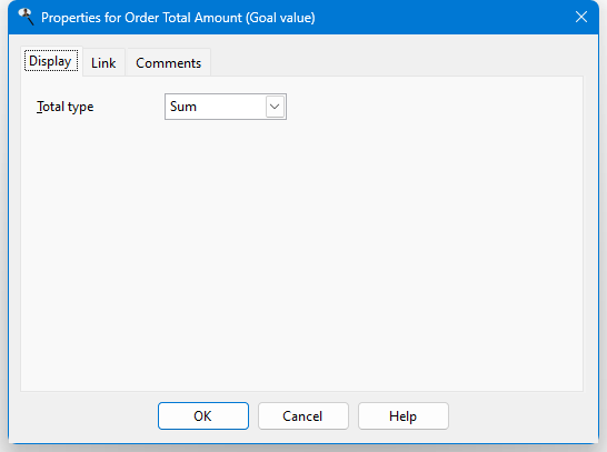 Total type: this option allows you to specify whether a total ("sum"), average, highest, lowest, or count value appears for this field. Only Count is available for non-numeric fields. Set Total type to None if, instead of displaying summarized values, you want individual values charted.