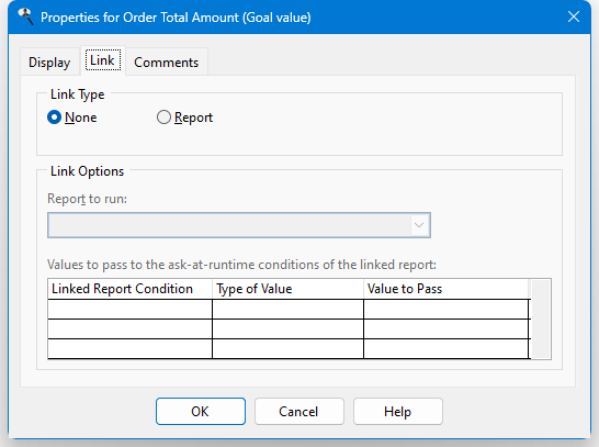 The Link page allows you to link the gauge to another report. When you click the gauge in the Preview window, the specified report is run. This acts like drilling down from one report to another.