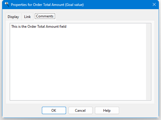 The Comments page shows any comments about the field, which is often used to provide a description of the field's contents.