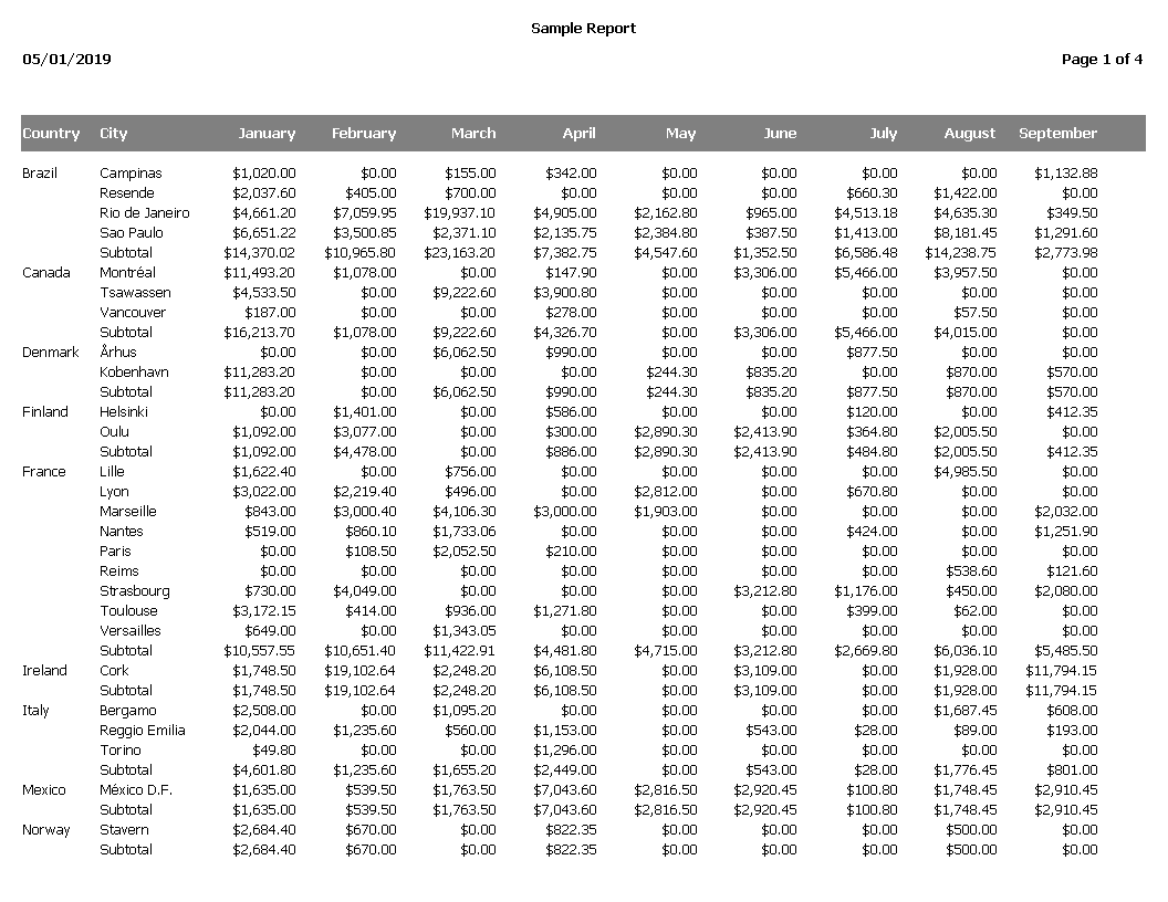 The new engine uses vertical, then horizontal pagination. For example, for a report that has enough rows for two sets of vertical pages and enough columns for two sets of horizontal pages (four pages total), the first page contains the first set of rows for the first set of columns, the second page contains the second set of rows and the same columns (the first set), the third page contains the first set of rows for the second set of columns, and the fourth page contains the second set of rows and the same columns (the second set).