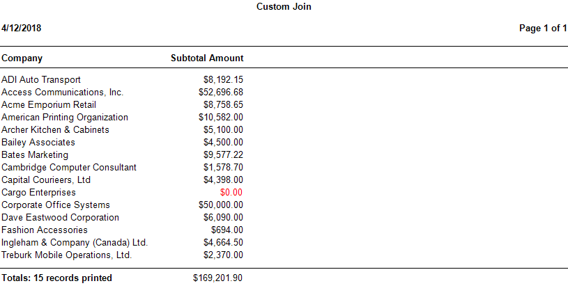 Custom Join: This report uses a custom join to show all customers whether they have invoices or not. Those customers with no invoices will be highlighted in red.