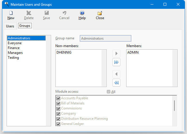 The Groups page allows you to maintain user groups. At the left of the page is a list of groups; click one in the list to select it. To the right is a text box where you can edit the name of the group (this is disabled for the Administrators and Everyone groups, but is available for any other group) and a control where you can select the members of the group. There are also controls where you can specify whether the group can access a particular module and a certain company.
