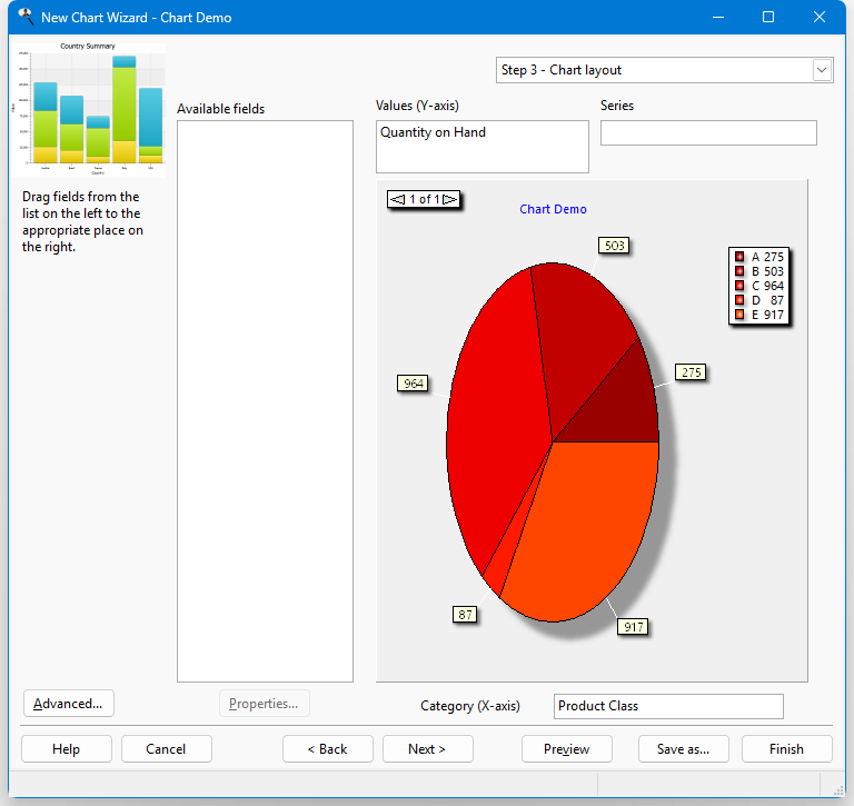 Series: A series field is used to create multiple charts. For example, to show a chart of sales by product by year, use the sale date as the series field and display the year rather than individual dates using the Properties dialog. Not all charts have a series field, and if the chart has more than one values field, it can't have a series field.
