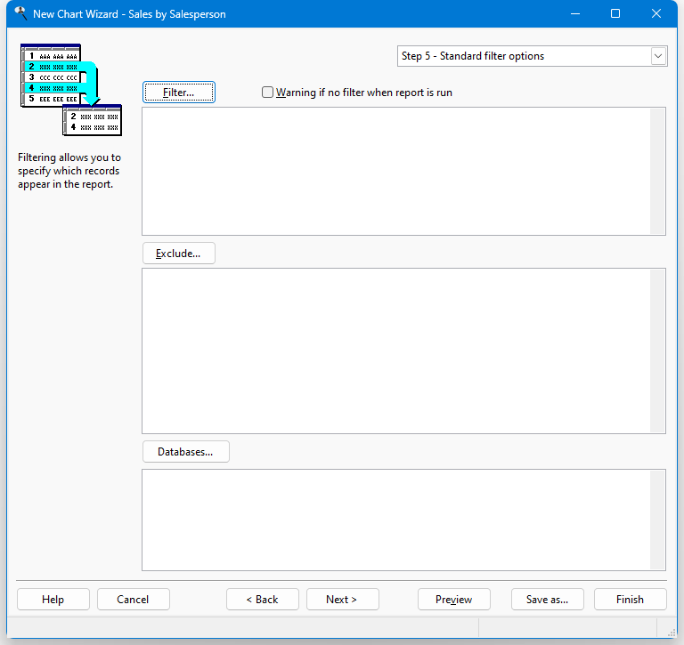 Step 5 allows you to specify a filter used by default for this report. You can skip this step if no filter is normally used.