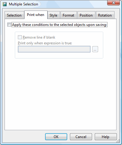 The Properties page allows you to change the Remove line if blank and Print only when expression is true options for all selected objects; see the Field Object Properties topic for a description of these options. Turn on the Apply these conditions to the selected objects upon saving option to enable the options on this page. Any changes you make are applied to all selected objects.
