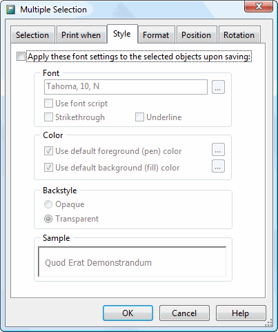The Style page allows you to change the style options for all selected objects; see the Field Object Properties topic for a description of these options. Turn on the Apply these font settings to the selected objects upon saving option to enable the options on this page. Any changes you make are applied to all selected objects.