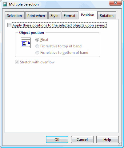 The Position page allows you to change the position options for all selected objects; see the Field Object Properties topic for a description of these options. Turn on the Apply these positions to the selected objects upon saving option to enable the options on this page. Any changes you make are applied to all selected objects.