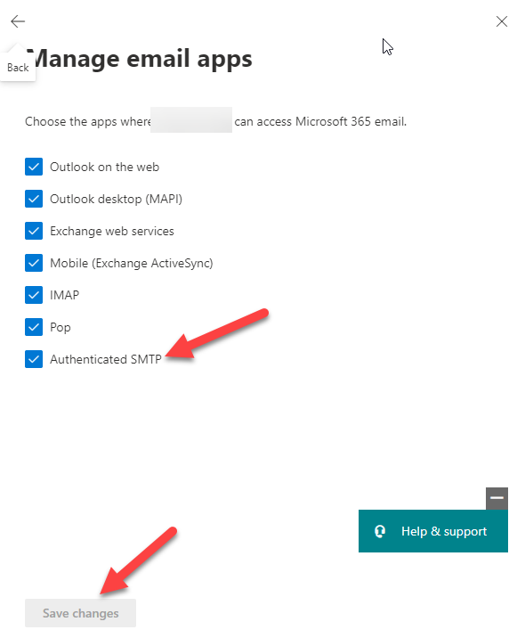 • Have the administrator enable SMTP: navigate to https://portal.office.com, select Active Users in the panel at the left, select the desired user, click Mail, and click Manage Email Apps in the Email Apps section.
