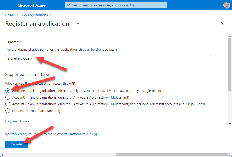 • Fill in the name of the application. The name isn't important; it's just used to identify it in the list of registered applications, so use a name that's meaningful.