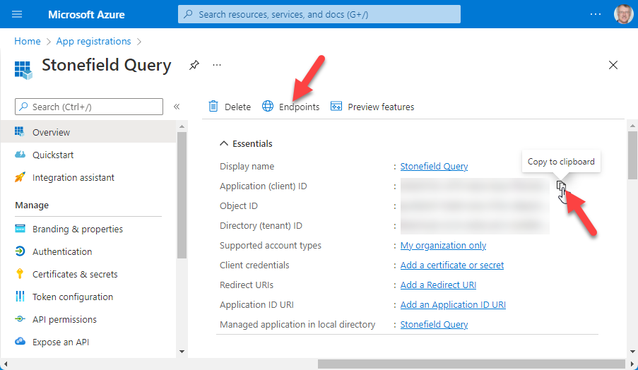 • In the page that appears, hover your mouse over the right side of the Application (client) ID setting (blurred out in this image for obvious reasons) to make the Copy to Clipboard button appear, click that button, then paste the clipboard somewhere to save it. This value goes into the Client ID setting of the Email page in the Options dialog.