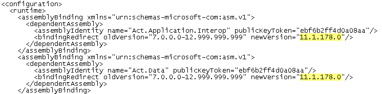 Finally, use Notepad to edit the sfquery.exe.config file in the Reporting4Act! program folder. Modify each newVersion entry to match the version number you found in the assembly folder in step 1. The following screenshot shows the first two entries in the config file properly edited to the 11.1.178.0 version number.