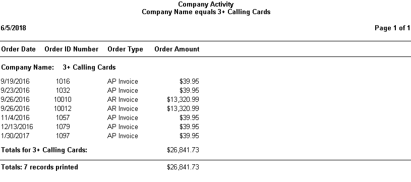 Drilldown Child - Company Activity: This report can be run on its own and will list Orders by Company or it can be run by running the "Company List - Drilldown Parent" report and clicking on a Company Name.