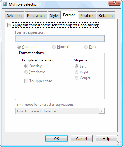 The Format page allows you to change the format options for all selected objects; see the Field Object Properties topic for a description of these options. Turn on the Apply this format to the selected objects upon saving option to enable the options on this page. Any changes you make are applied to all selected objects.