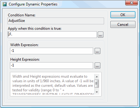 Height Expression: enter a value or click the button to display the Expression Builder to specify a height to use when the condition is true. The height must be specified in inches or centimeters, depending on how your system is configured. The default of -1 means use the height already defined for the object.