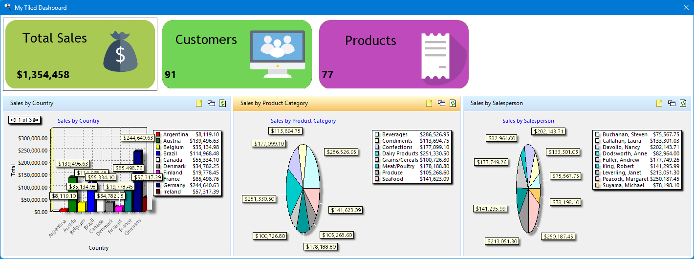 You typically run a tiled dashboard to view important information about your business. You may run a tiled dashboard at the start of the day and leave the dashboard window open all day, or open and close it as you see fit. The reports in the dashboard refresh themselves at an interval you specify (the default is every ten minutes) so the data is always current.
