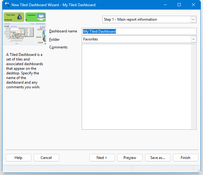 To create a tiled dashboard, follow the steps in the Creating a Report topic. The Dashboard Wizard shown below appears.